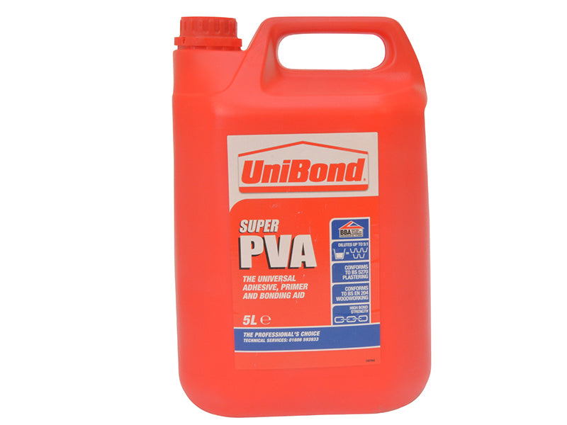 UniBond Super PVA is ideal for use as a primer and bonding agent on plaster, or priming and dust proofing porous surfaces. It bonds together most common building materials, as long as one is porous. Suitable for use in dry service conditions. The universal adhesive, primer and bonding aid. The only BBA accredited PVA in the market.