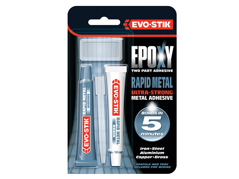 Evo-Stik Epoxy Rapid Metal is a 2-part, multipurpose epoxy adhesive specially formulated with stainless steel to form an ultra-strong bond. It sets in just 5 minutes and it can be roughly handled or machined approximately 10 minutes after application.