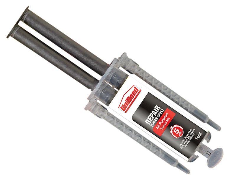 The UniBond All-Purpose 5 Min Repair Power Epoxy is a reactive, fast setting, 2-component, non-shrinking, non-expanding, solvent-free adhesive supplied as a twin chamber syringe. Ideal for bonding non-porous to non-porous surfaces. Use for bonding, repairing and filling wood, metal, glass, ceramics, rubber, leather, masonry, cardboard and most plastics. Sets in 5 minutes. Translucent when set.