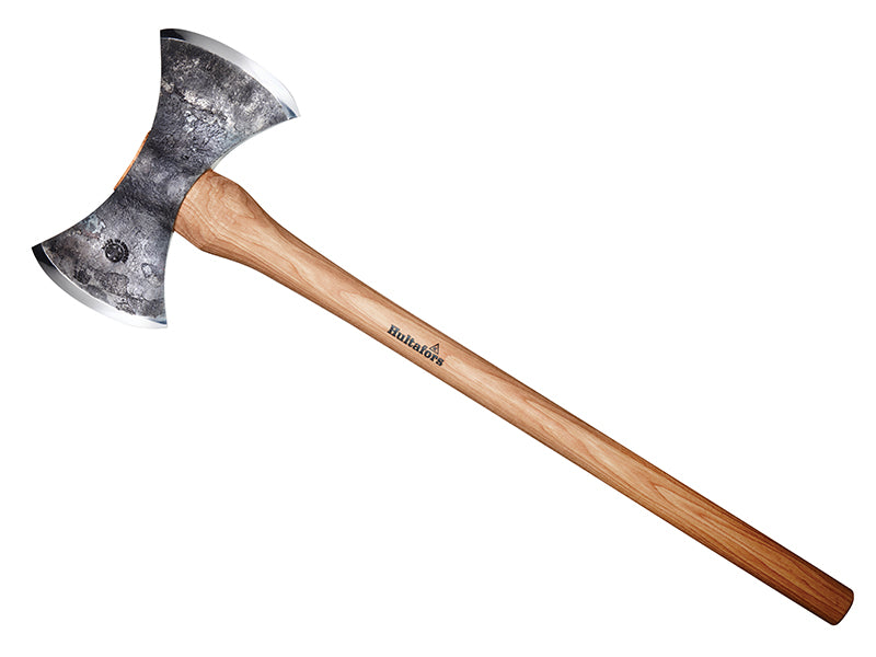 The Hultafors Hults Bruk Wetterhall Throwing Axe benefits from the possibility of always having a sharp axe around. While using one edge for rough work, they could be more careful with the other. Originally used by lumberjacks, today it is primarily employed in throwing competitions among enthusiasts. The handle is made from American hickory and treated with linseed oil for increased durability.