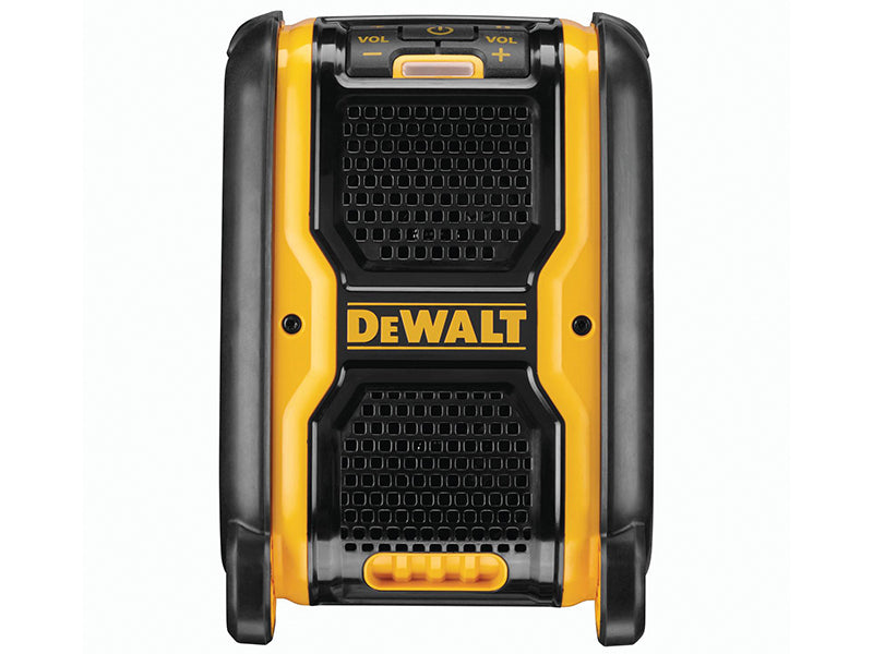 The DEWALT DCR006 XR Bluetooth® Speaker has a compact and robust design that streams audio from any Bluetooth® enabled device. It is fitted with 2 x 50mm speakers that provide high-fidelity audio and the integral roll cage provides impact resistance for maximum durability. There is also a 3.5mm auxiliary port which allows for connection to portable audio devices.
