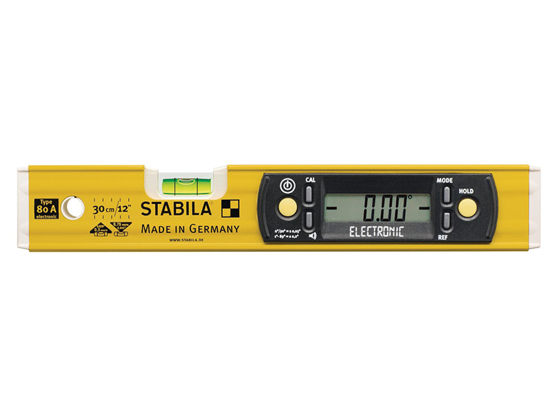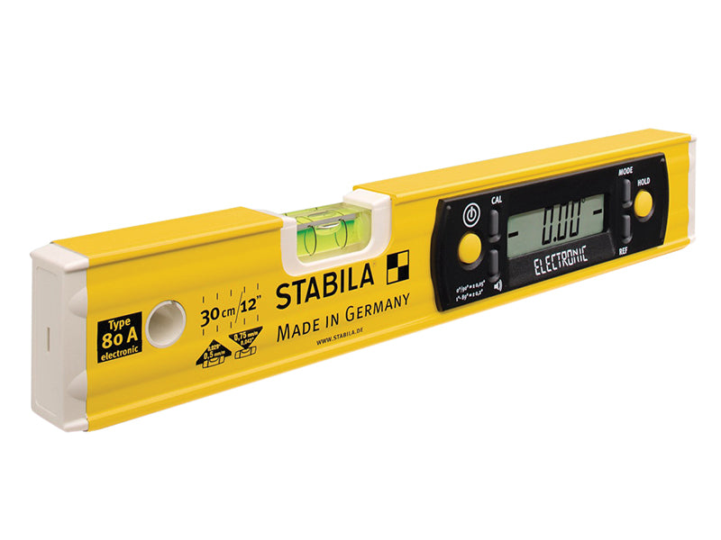 Stabila 80A-E-30cm Electronic Level uses audio angle guidance system with 3 different signals. You can align items without looking at the vial. The easy-to-read digital display - automatically rotates for overhead measurements. Features 1 horizontal vial.