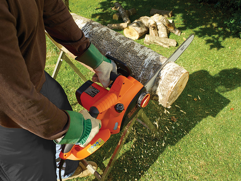 The Black and Decker CS2040 Chainsaw is fitted with a high torque motor that produces a chain speed of 12.5m/s. It has a large cutting capacity of 40cm for large cutting tasks and the low kick back chain provides a smooth, fast cutting action through wet and dry timber. It is quick and easy to fit and adjust new chains thanks to the tool-free chain tensioning system.