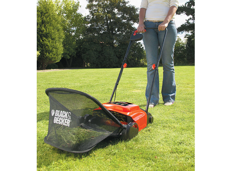 The Black & Decker GD300 Lawnraker is suitable for medium gardens and has a 30cm raking width with a rear roller and 3 raking heights for year round maintenance. The raking mechanism has metal tines. A large capacity, front loading grass box provides easy collection and disposal of debris. Central height adjustment system for speed and ease of use.