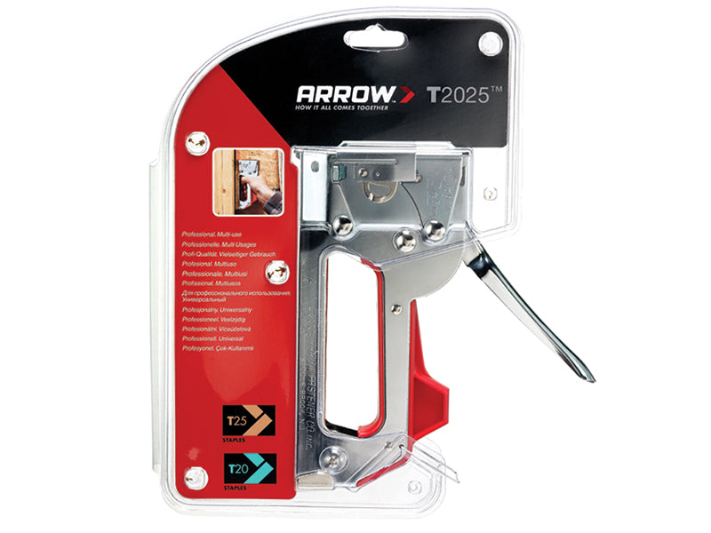 The Arrow T2025 Staple & Wire Tacker with built-in staple height guide. The revolutionary guide is easy-to-use and enables this powerful Staple Gun to shoot flat crown staples and round crown staples. The guide can be adjusted so that round crown staples will fit wire and cable from 1/8in (3mm) to 1/4in (6mm) diameter.