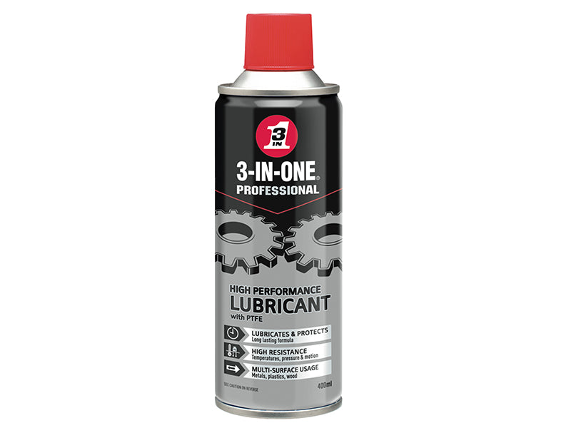 3-IN-ONE high performance lubricant is an advanced PTFE synthetic flouropolymer formula which provides outstanding lubrication and corrosion protection under extreme temperature, pressure and motion. Friction and wear is dramatically reduced on all moving parts which also extends the life of tools and machinery. Suitable for use on all metal and non-metal surfaces including wood, glass, vinyl, rubber and plastics (except polycarbonate and polystyrene). This high performance lubricant will also drive out moisture and is capable of withstanding extreme temperature from -45 ° to +235 ° C.