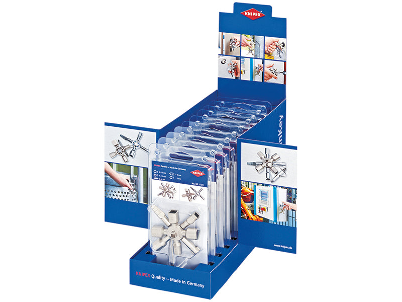 Counter Display containing 10 x Knipex TwinKey® Service Cabinet Keys. This clever multifunctional tool is designed to provide access to 25 different service cabinets and switch keys. Perfect for heating and sanitation, air conditioning, electro technology, gas and water supply and shut-off-systems. Consists of two 4-way spider keys connected using magnets providing space saving storage.