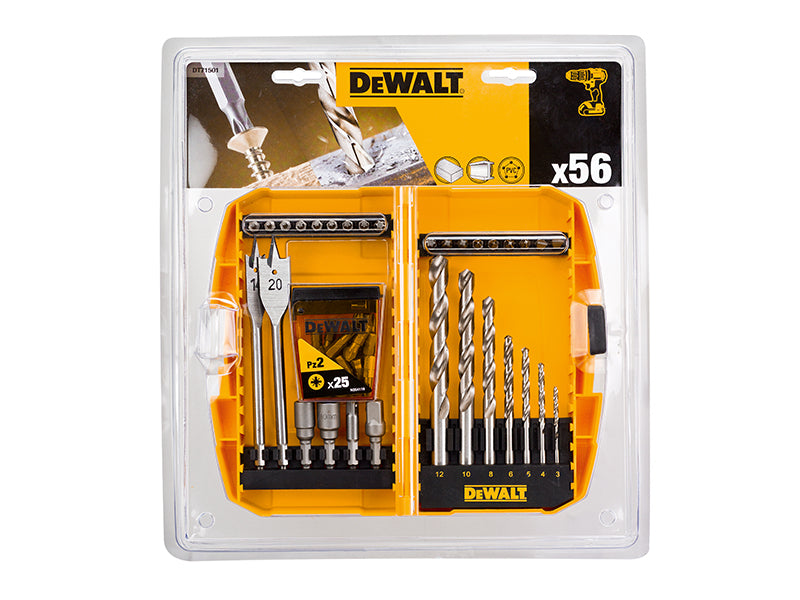 The DEWALT DT71501 56 piece Drilling & Screwdriving set is ideal for wood drilling, metal drilling and screwdriving applications. It comes in a medium size tough case for convenient storage and portability of the high quality professional screwdriver bits. These are designed with a flexible torsion zone to absorb torque peaks and reduce breakage.