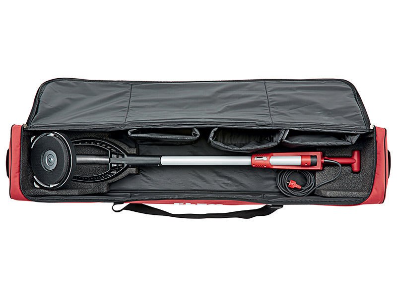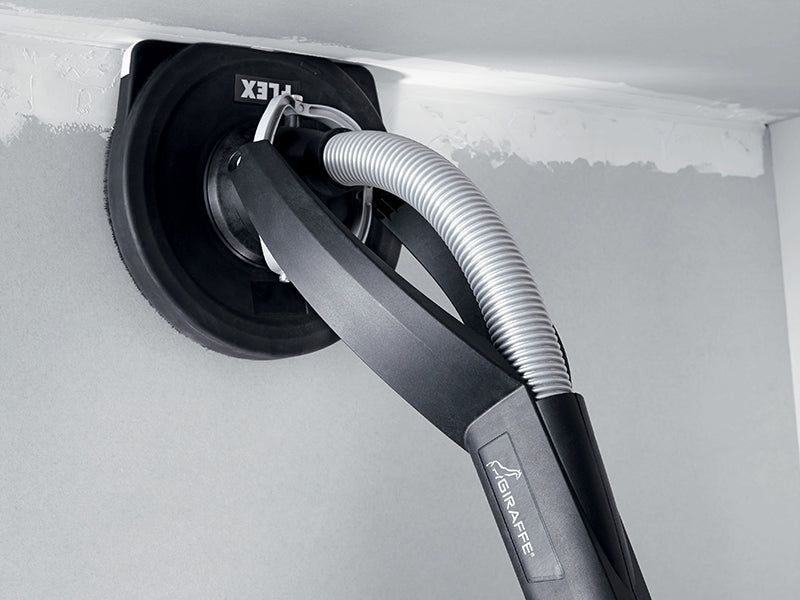 The giraffe® sander uses electronic controls: controlled constant speed, soft-start, overload protection and speed selection with an adjuster wheel. The gimbal-mounted sanding head provides high flexibility and optimum adjustment for sanding walls and ceilings.