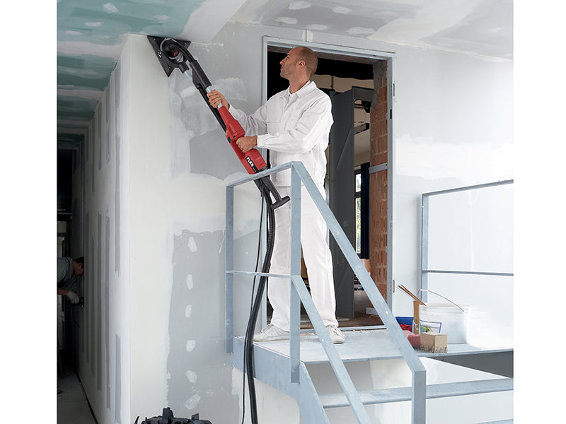 The Flex VarioPlus Giraffe® wall and ceiling sander is ideally suited for sanding plaster boards, solid Styropor® insulation slabs, preparation for painting and polishing. It has electronic control which gives controlled constant speed, soft-start, overload protection and speed selection with an adjuster wheel. Using a unique telescopic system, the Vario-Giraffe adapts to your needs with the length being adjustable from 1330mm to 1730mm. The handle rotates through 360° .