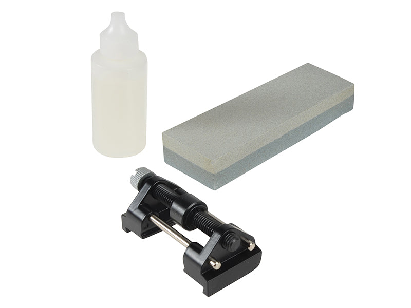 The Roughneck Chisel Sharpening Kit is ideal for the sharpening of all wood chisels ranging between 6mm and 50mm. The honing oil is a mechanical oil that is petroleum based. There is a strong and solid sharpening guide with a screw for width adjustment. Full sharpening instructions and safety guidance are included on the packaging.