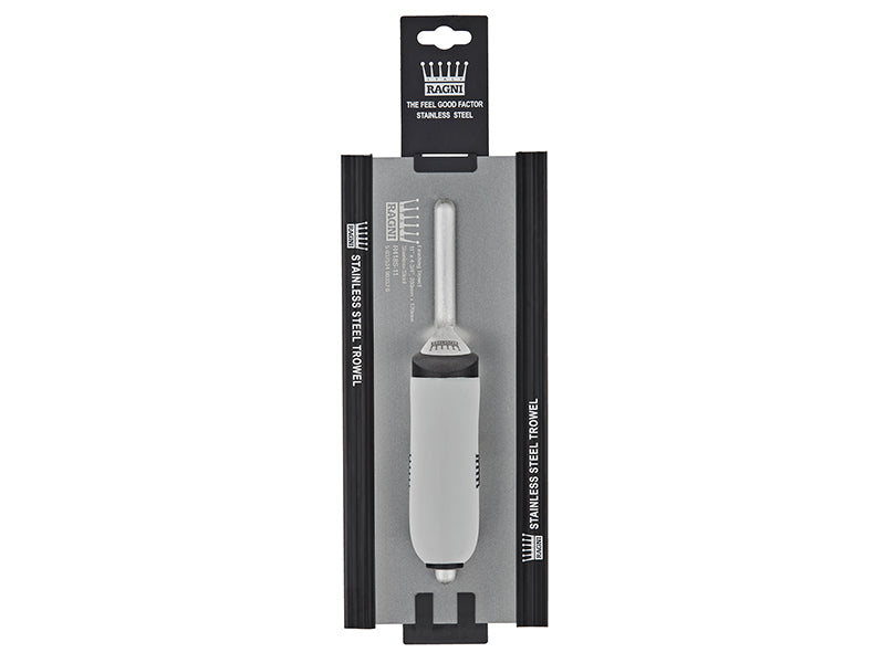 The Ragni R418S-11 Plasterer's Finishing Trowel has a stainless steel blade. Fitted with a banana shaped, aluminium die-cast handle. The Easi-Grip™ provides comfortable all-day use. It also features hidden rivets and a swept back stem.