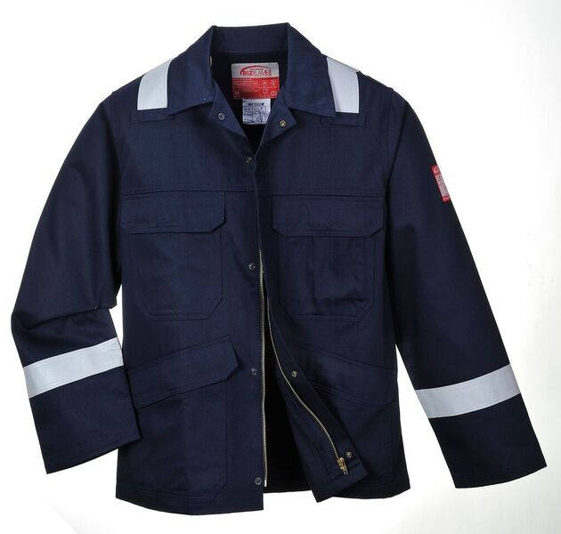 This Jacket is constructed with high visibility reflective tape double stitched for enhanced durability. Features include triple stitched seams, high visibility strips on shoulders, and arms, concealed front brass zip, two front chest pockets with flap and stud closure. Adjustable sleeve opening.