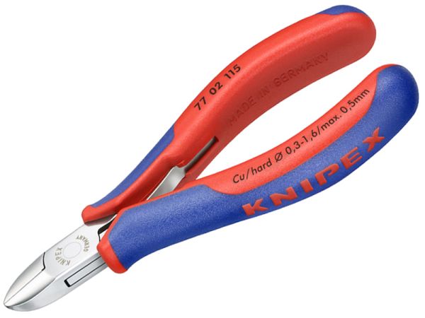 The Knipex 77 12 Electronic diagonal cutter are a top quality precision cutters for ultra fine cutting work in electronics and fine mechanics. Has around head, bevelled with wire clamp and round head, NON-bevelled. They have precision shaped tips which are ideal for cutting close sitting wire, soft wire up to 1.6mm to hard wire up to 0.5mm diameter.