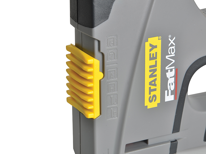 The Stanley FatMax® heavy-duty 6-in-1 stapler TR75, suitable for many types of nail, brad and pin. The tacker is bottom loading, has a low angle handle for easier use, and a built-in wire guide/staple window.