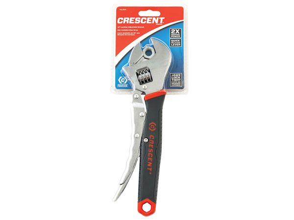 The Crescent Locking Adjustable Wrench combines the versatility of an adjustable wrench and the gripping power of a locking plier. It has an anti-slip adjustable jaw that fits a wide variety of fasteners and delivers twice the gripping power on a rounded fastener. Fitted with a quick-release handle with a dual material comfort grip for increased comfort.