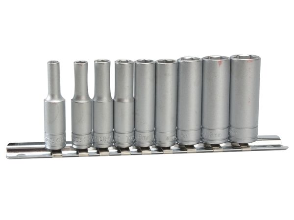 1/4in Drive 9 piece metric deep socket set consisting of: