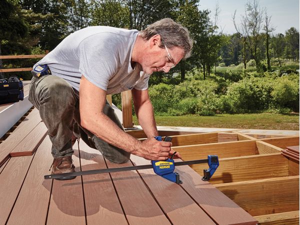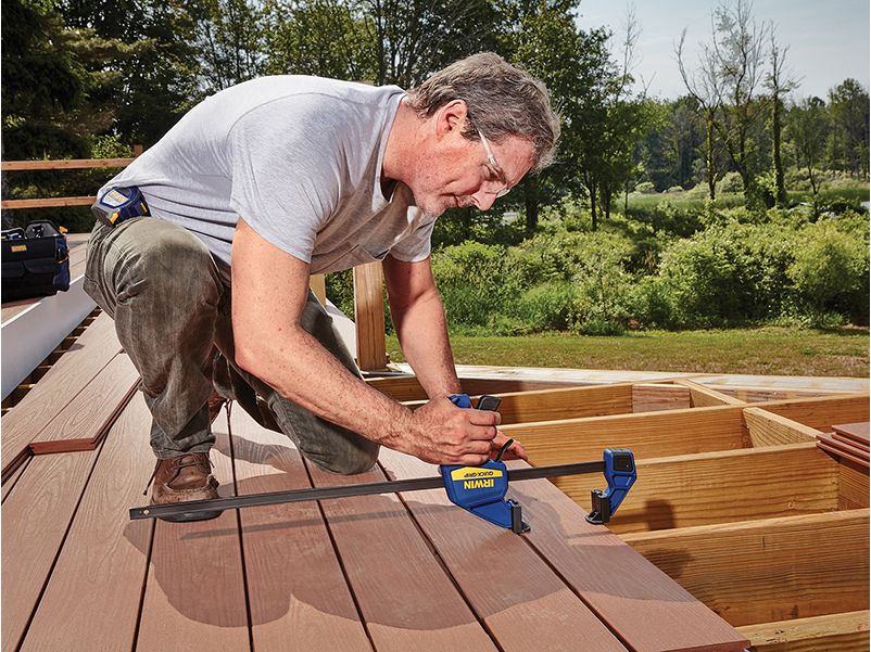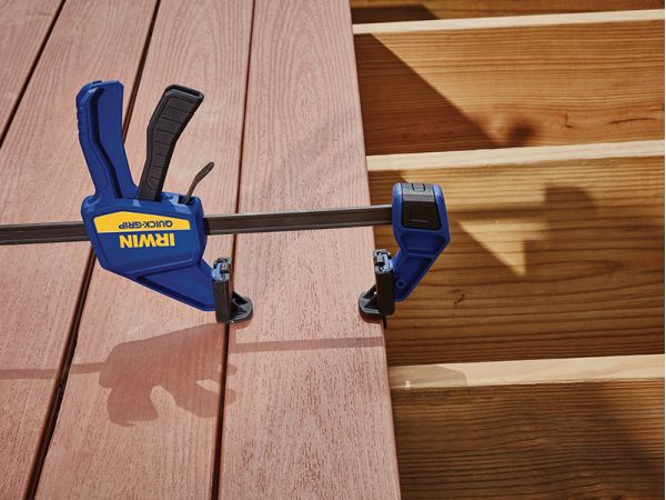 The Irwin® Quick-Grip® Deck Clamp Accessory Kit turns your medium-duty one-handed bar clamp into a deck clamp for easy, accurate deck building. The converted one-handed bar clamp is designed for lining up, spacing and holding boards in place.