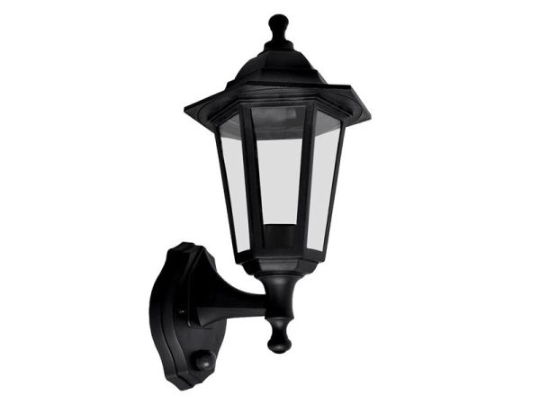 Meridian Six Panel Lantern with PIR motion detection for added security; 120° 10m detection area. Manufactured from die-cast aluminium with a black powder-coated finish. Fitted with a clear, impact-resistant polycarbonate diffuser. Suitable for outdoor use, weather-resistant IP44 rating.