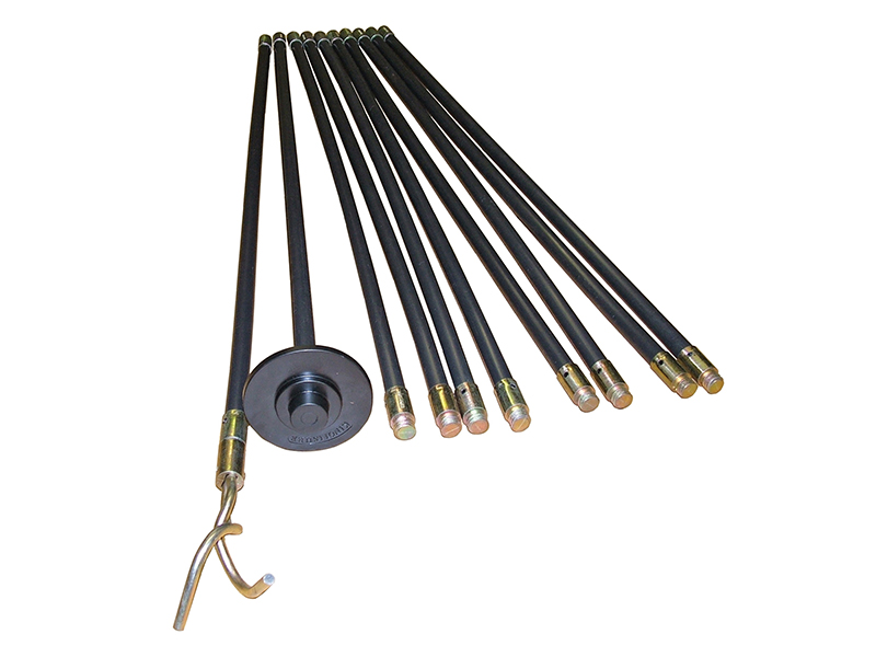 The set consists of ten flexible, screw together rods which can reach up to 9 metres in length when fully assembled. Each 920mm polypropylene drain rod has crimped and pinned rustproof connectors for extra strength and the kit is supplied complete with a 100mm rubber plunger and a 50mm double worm screw.