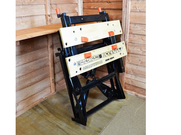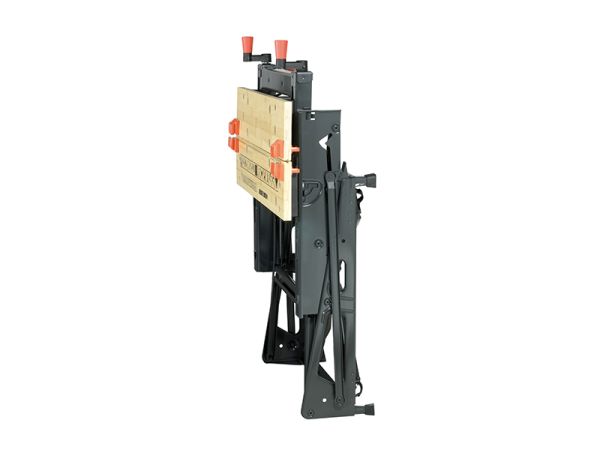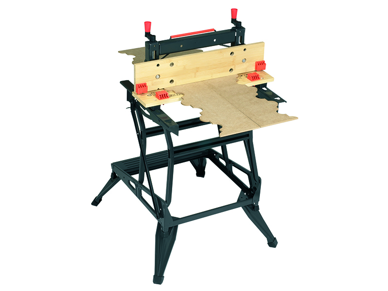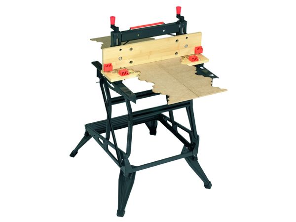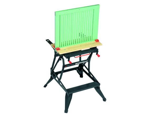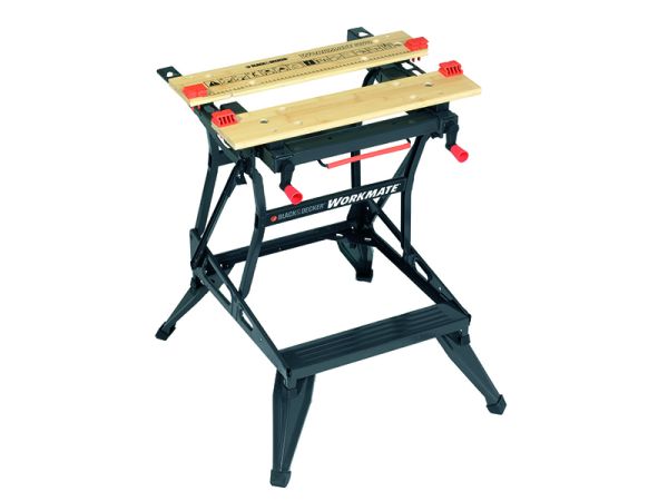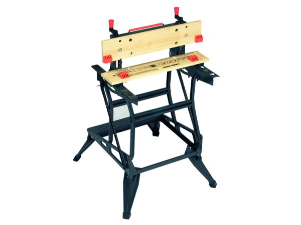 The Black & Decker WM550 Workmate® offers dual working heights, it can be used as a workbench, bench tool stand, vice, or sawhorse. Dual clamping cranks provide increased clamping force and versatility. The front jaw swings up for vertical clamping, increasing flexibility to clamp odd-shaped objects. With adjustable swivel pegs and jaw retention grooves for added clamping versatility and reliable material hold.